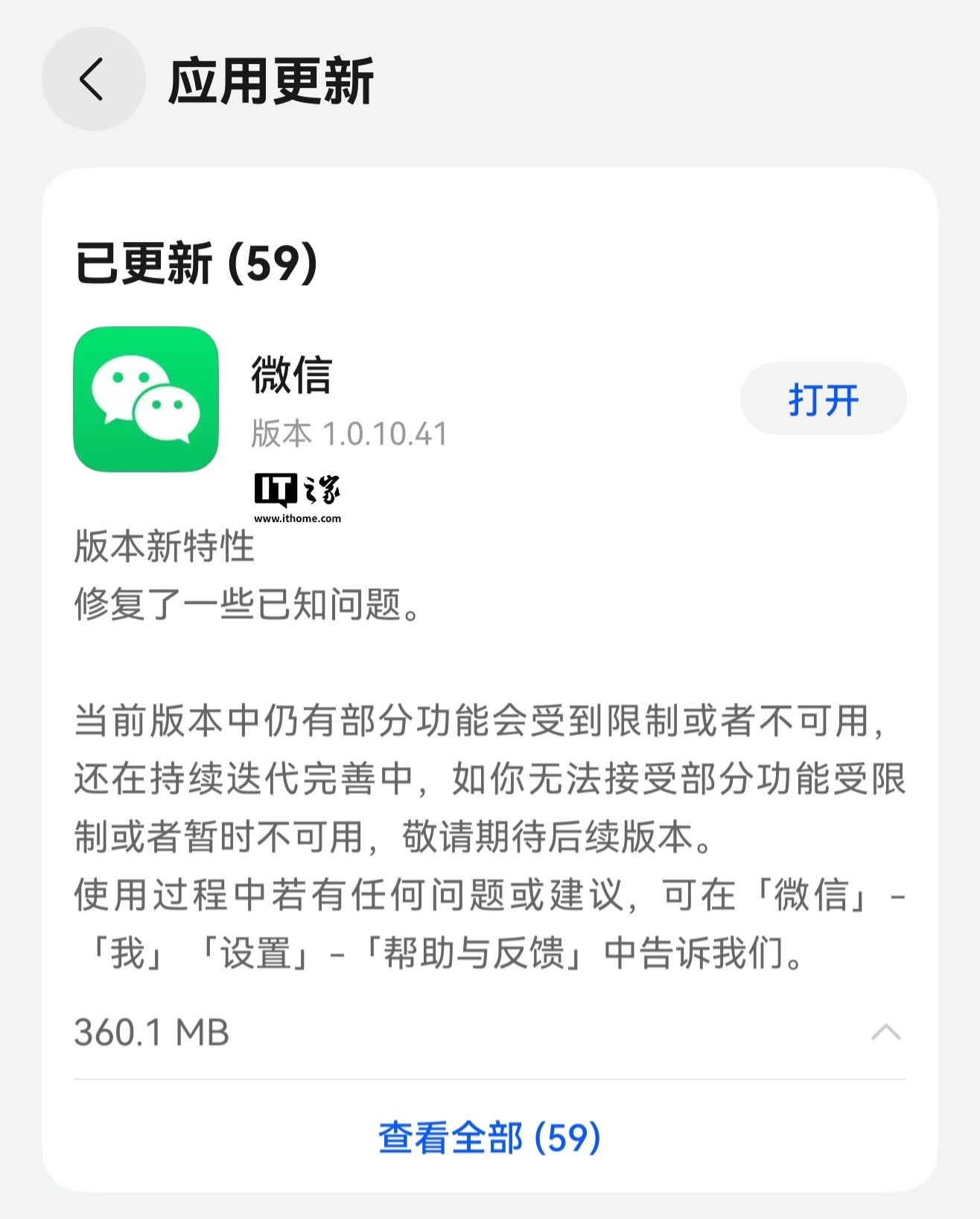 IT之家 9 月 18 日消息,微信鸿蒙版 App 昨日在华为应用市场(App Gallery)开启 1.0.10.41 正式版本升级,大小约 360.1 MB,版本新特性: