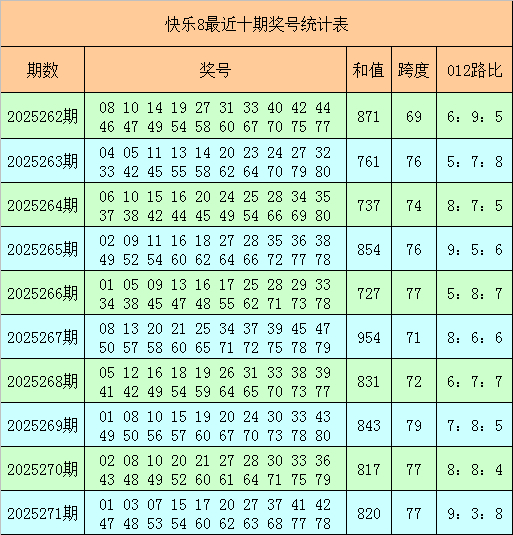 快乐8第2025271期奖号为:01 03 07 15 17 20 27 37 41 42 47 48 53 54 60 62 63 68 77 78,其中奖号012路比为9:3:8,和值为820,跨度为77。